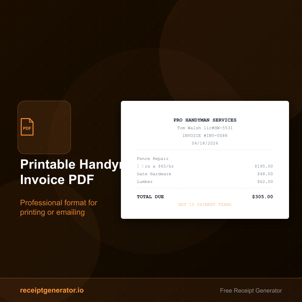 A printable handyman invoice PDF should be complete, one page where possible, and easy to read without extra formatting. Check every line before you print or send — a clean invoice is the fastest path to getting paid.