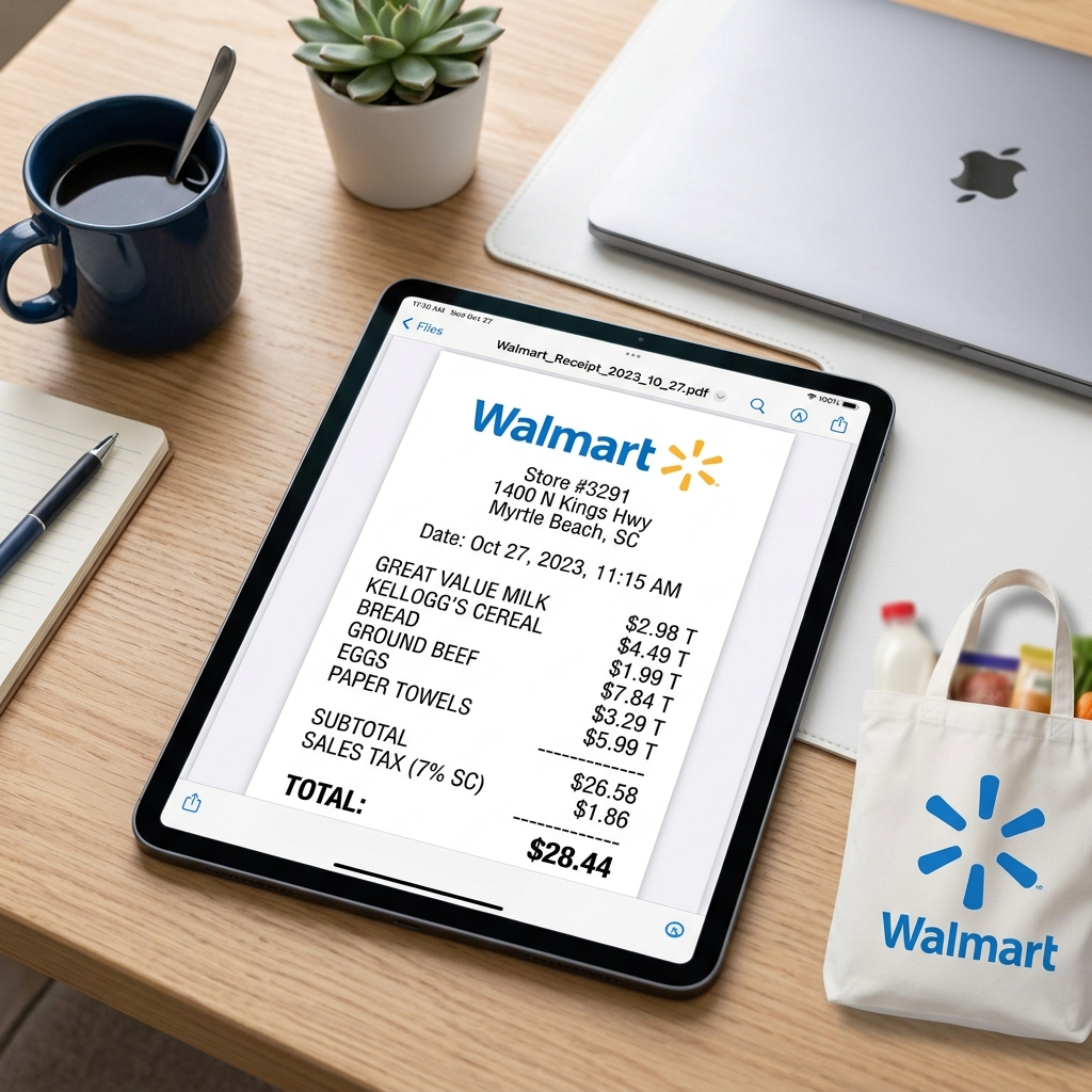 A printable Walmart receipt PDF should clearly show the store, purchase date, item lines, tax, total, and payment summary.