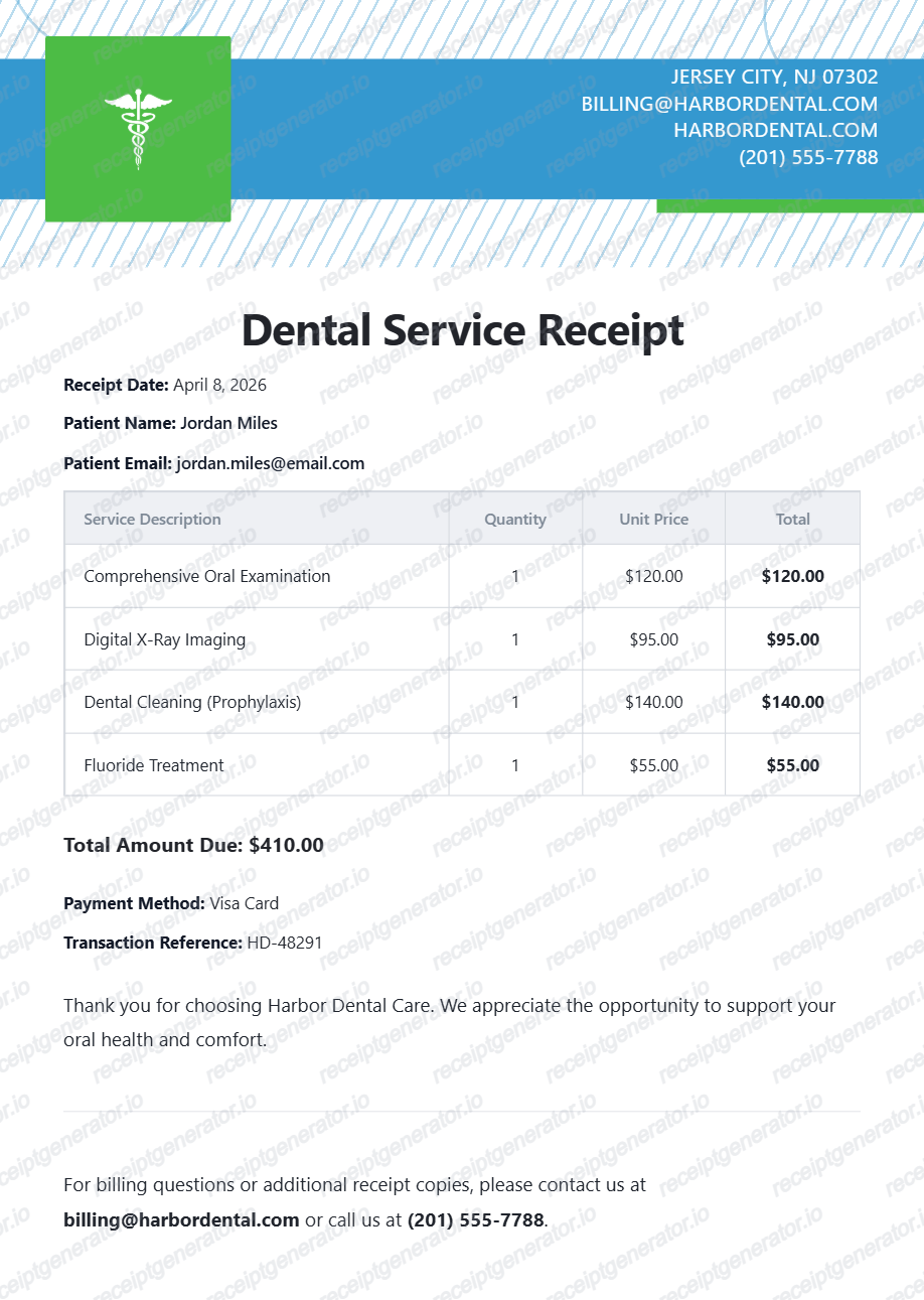 Generate a dentist service itemized bill online with clinic contact information, patient identity details, treatment rows, quantity and unit price fields, total amount due, and payment reference information. Export a clean PDF for billing records and dental office documentation.