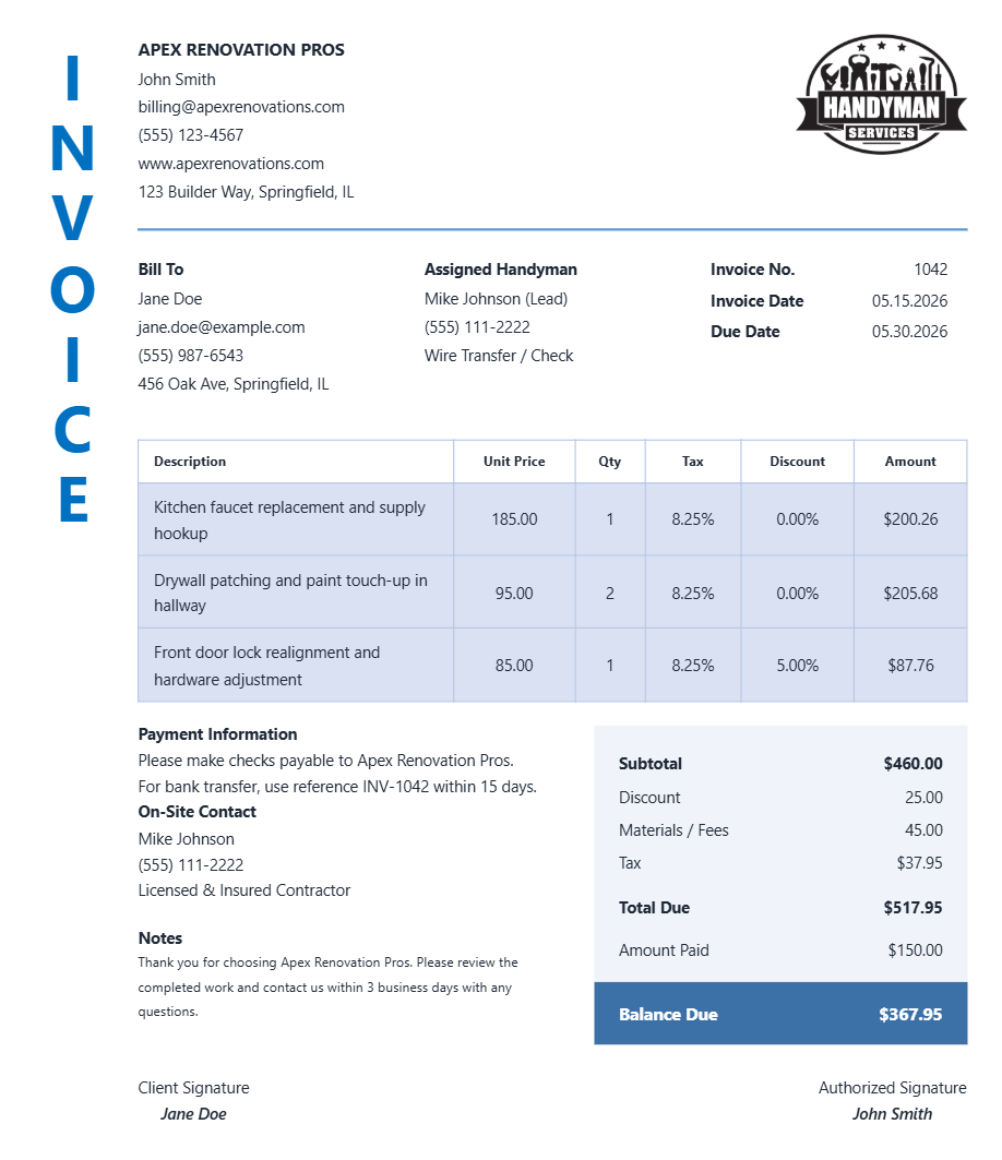 Create a handyman invoice online with contractor details, client billing info, itemized labor and materials, payment instructions, and balance due. Export a clean PDF instantly.
