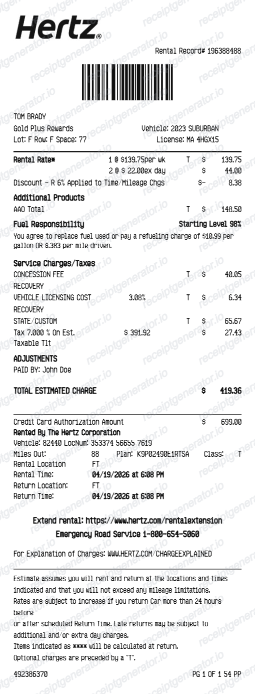 Hertz Car Rental Receipt Generator
