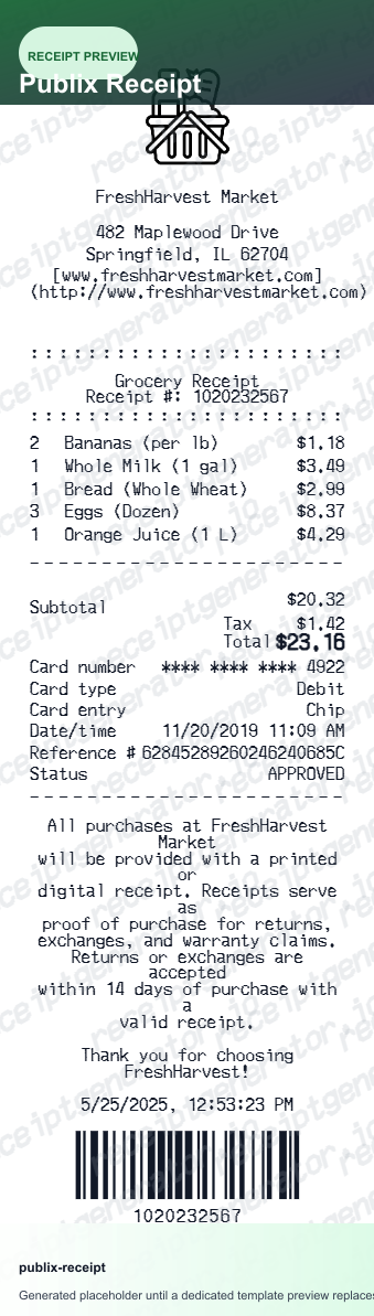 Need a Publix receipt for expense records or return documentation? Use this free Publix receipt generator - add grocery items, BOGO savings, and taxes - download a clean PDF in seconds.