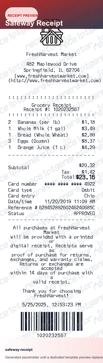 Need a Safeway receipt for expense records or budget tracking? Use this free Safeway receipt generator - add grocery items, Club Card savings, and Gas Rewards - download a clean PDF in seconds.